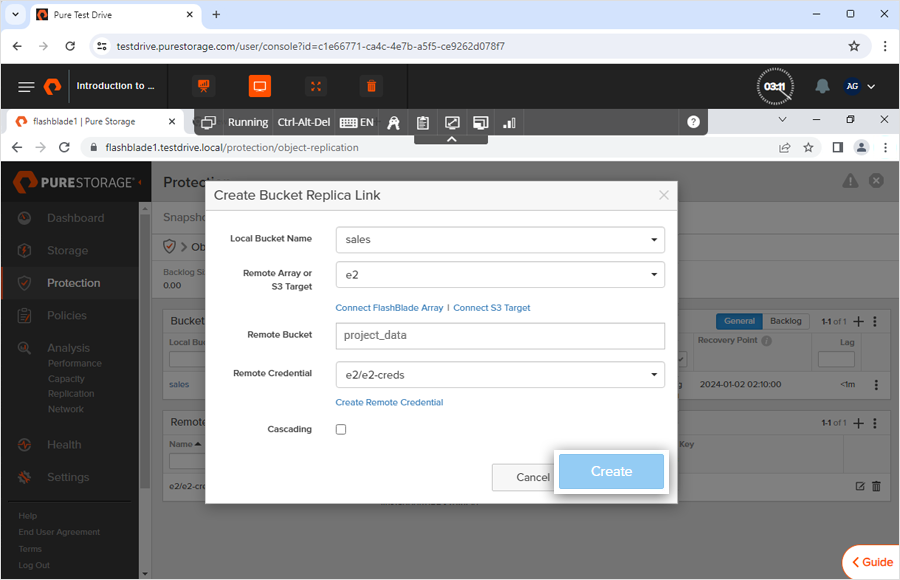 6. Enter your remote credentials and click Create. The bucket replica link will be created.